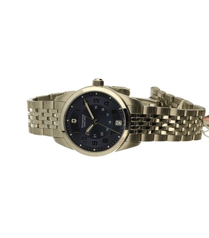 Water resistent 100 m, urkasse og ledlænke af rustfrit stål, foldelås. Urkasse 33 mm diameter, safirglas for og bag. Blåmetallice skive med arabertal. Fabrisnyt, nypris 5400,- stammer fra ophør.
