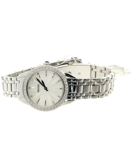 Ref.SRZ385P1, water resist 30m, urkasse og ledlænke af rustfrit stål, foldelås, urkasse prydet med swarovskisten 30 mm diameter, sølvskive med stregindex prydet med swarovskisten. Safirglas. Fabriksnyt, nypris 1995,- stammer fra ophør.