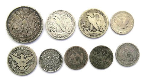 Samling beståede af Dollar sølv 1880, Half Dollar sølv 1912, 1918, 1938, Quarter sølv 1861, 1873, 1892, 1901, 1929.