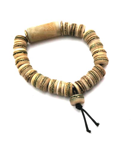 Armlænke med segmenter fra tibetansk bedekrans, omviklet af guldtråd, front prydet med jade. L. justerbar.