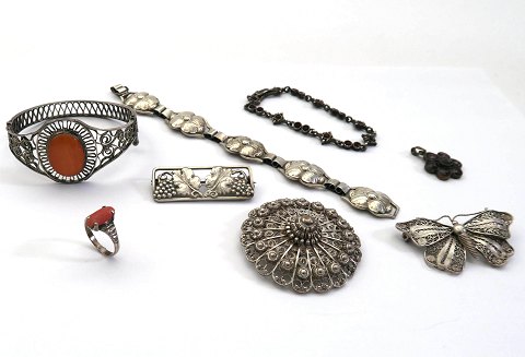 Lot bestående af tre brocher, armring, armlænke, vedhæng og armlænke med granater samt ring af sølv, prydet med koral. Ring Str. 51.