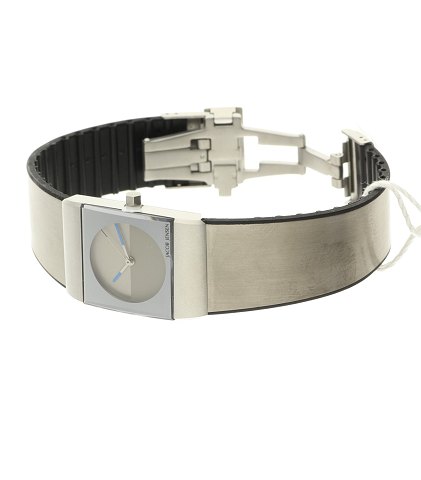Swiss made, water resistent, urkasse og rem af rustfrit stål, rem beklædt med gummi på bagside, foldelås. Urkasse 23 x 33 mm, 2-farvet grå skive, safirglas. Fabriksnyt, nypris 4495,- stammer fra ophør.