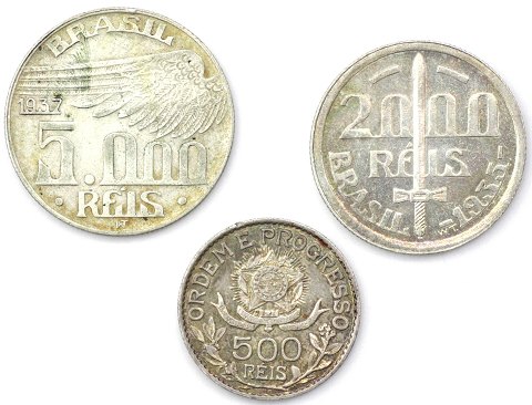 Brasilien, 500 Reis 1913, KM# 512 , 2000 Reis 1935, KM# 535 og 5000 Reis 1937, KM# 543, sølv(3)