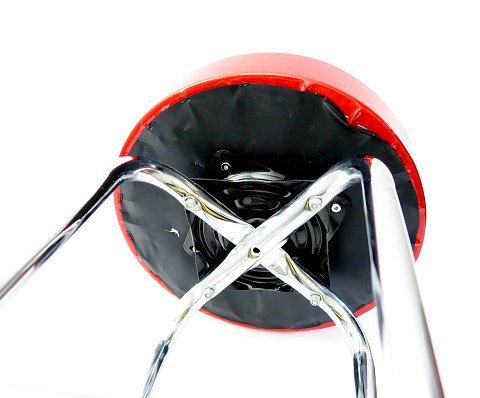 Sæde med knaldrød glimmerkant. Sæde høje 75 cm., drejelig, men ikke højdejusterbar, diameter 38 cm.