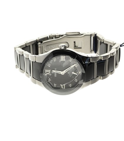 Ref. 16588/3, water resist, urkasse og ledrem af rustfrit stål, ledrem med sort ceramicled og foldelås. Urkasse 33 mm diameter, sort skived med romertal og små brillianter. Safirglas. Fabriksnyt, nypris 1748,- stammer fra ophør.