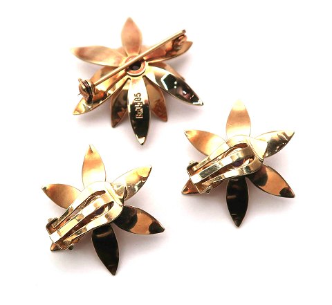 Lot bestående af blomstformet broche med tilhørende øreclips af 14 kt. guld. Hver del prydet med facetsleben ametyst, diameter 6 mm. Broche diameter 35 mm., samlet vægt ca. 16,5 gr.