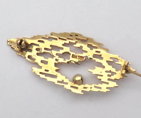 Moderne broche af 14 kt. guld, prydet med 4½ mm. kulturperle. Broche L. 53 mm., samlet vægt ca. 6,5 gr.