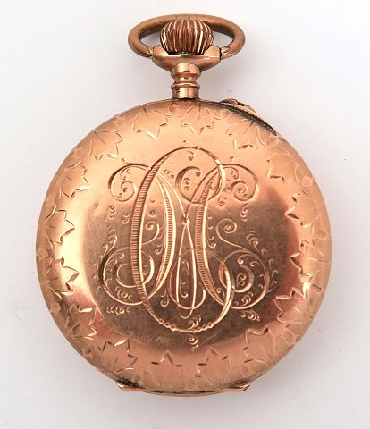 Dame lommeur i urkasse af 14 kt. guld. Hvid emailleret skive med arabertal og stregindikation. Urkasse af 14 kt. guld dekoreret med omløbende blomstermotiv samt monogram CM. Inderkapsel af metal. Urkasse diameter 35 mm., samlet vægt ca. 30 gr.
