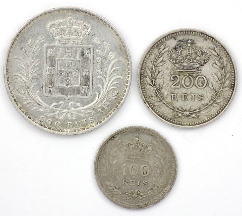 | Portugal, Manuel II, 100 Reis, 1910, 200 Reis, 1909 og Luiz I, 500 Reis, 1889, sølv(3)