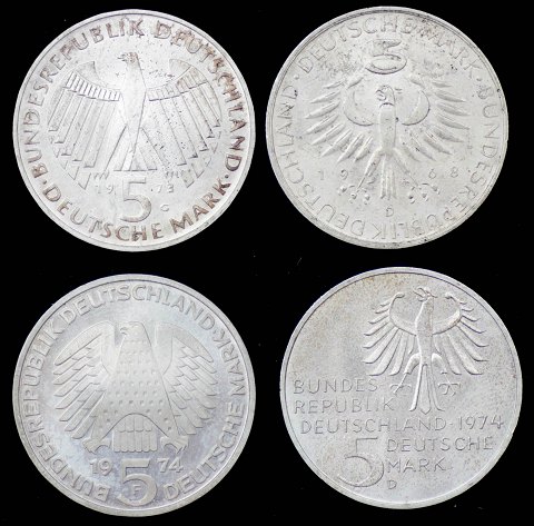 Tyskland, Erindringsmønter, sølv, 5 Mark, 1973 G, 1968 D, 1974 F, 1974 D (4)