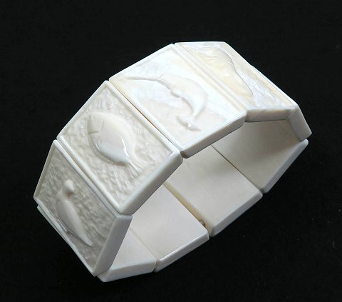 Armlænke med 9 narhval tand segmenter, skåret med dyr i form af isbjørn, hvalros, sæl, narhval, fladfisk, rype, hare, polarræv og slædehund. Tandsegmenter er monteret med elastik og måler 35 x 24 mm.