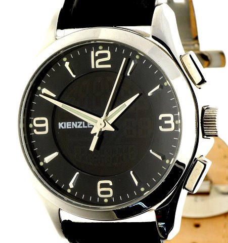 Quartz, water resistent, urkasse af rustfrit stål 42 mm diameter, sort skive med arabertal/stregindex, sort krokrodilleskindspræget læderrem med foldelås. Fabriksnyt, nypris 749,- stammer fra ophør.