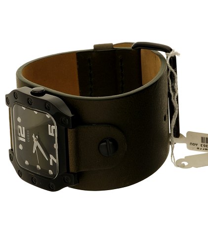 Quratz, urkasse af sort blank stål 42 x 35 mm, grønmetallic skive med arabertal/punktindex. 41 mm bred soldatergrøn læderrem. Fabriksnyt, nypris 1195,- stammer fra ophør.