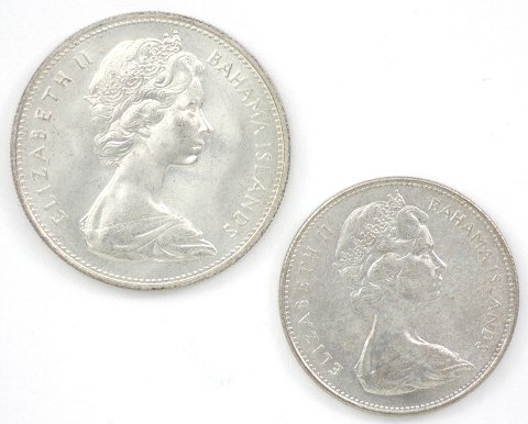 Bahamas, Dollar, 1966, sølv, 18.14 gr., .800, KM# 8 og 5 Dollars 1966, sølv, 29.80 gr., .925, KM# 9(2)