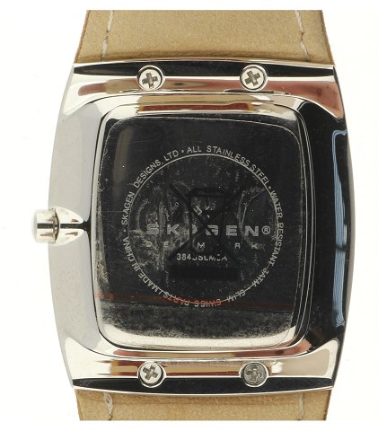 Quartz, water resistent, urkasse af rustfrit stål 28 x 31 mm, prydet med små zirkoner i kanten, marmor metallic skive med arabertal prydet med små zirkoner, brun krokrodilleskindspræget læderrem. Fabriksnyt, nypris 998,- stammer fra ophør.
