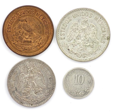 Mexico, 10 Centavos 1894, KM# 403.7, 20 Centavos, 1955, KM# 440, 50 Centavos, 1913, KM# 445 og 50 Centavos, 1920, KM# 447 (4)