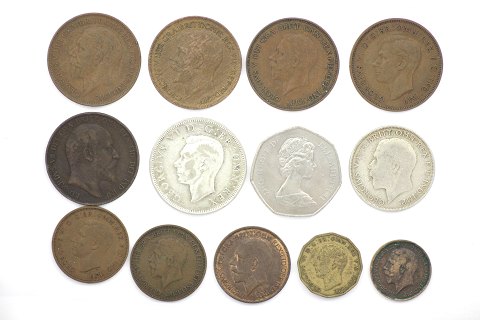 England, George V, George VI og Elizabeth, Farthing 1913, ½ Penny 1923, 1932 og 1942, Penny 1902, 1921, 1927, 1936 og 1937, Florin 1921, ½ Crown 1946, 3 Pence 1946 og 50 Pence 1973.(13)