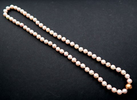 Ole Lynggaard kuglelås af 14 kt. guld, diameter 10,5 mm., vægt ca. 3 gr. Collier med 8½ mm. barokfarvede kulturperler, L. 60 cm.