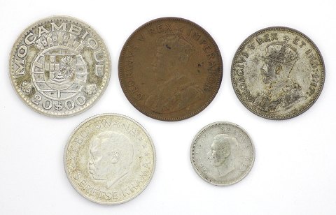 Afrika, Sydafrika 1 Penny 1936, 6 Pence 1951, East Africa 1 Shilling 1924, Mozambique 20 Escudos 1955 og Botswana 50 Cents 1966(5)