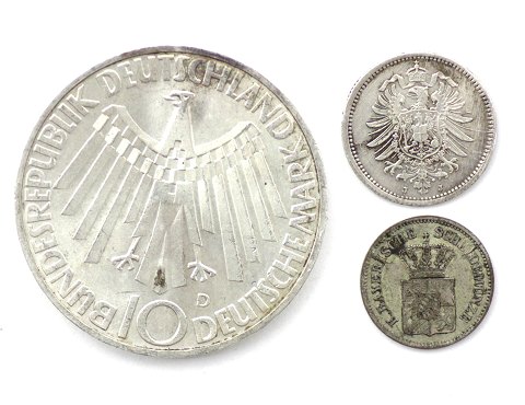 Tyskland, Bayern 1 Kreutzer, 1871, KM# 873, 20 Pfennig, 1876, KM# 5 og 10 DM 1972 D, KM# 134.1(3)