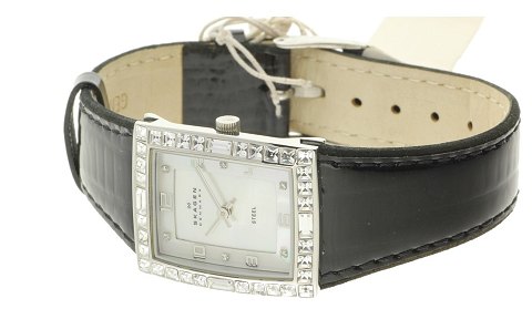 Quartz, water resistent, urkasse af rustfrit stål prydet med zirkoner 27 x 32 mm, perlemorsskive med arabertal/zirkoner, sort lak læderrem. Fabriksnyt, nypris 998,- stammer fra ophør.