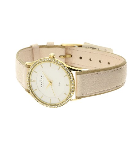 Quartz, water resistent, urkasse af rustfrit stål prydet med zirkoner 31 mm diameter, hvid skive med arabertal/stregindex,safirglas, sart lyserød perlemors læderrem. Fabriksnyt, nypris 998,- stammer fra ophør.