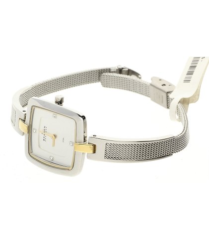 Quartz, water resistent, urkasse og rem af rustfrit stål, urkasse 24 x24 mm, sølv skive prydet med 4 zirkoner. Urrem 7 mm bred. Fabriksnyt, nypris 1098,- stammer fra ophør.