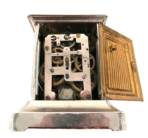 Kienzle vækkeur i urkasse af delvist forkromet metal med sider af glas. Front med mønsterpræg i messing. Lys skive med arabertal, separat sekundviser og vækketid indstilling. H. 15 cm. Tyskland omkring 1920.