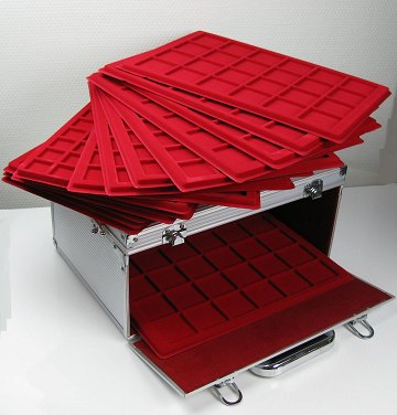 Flot opbevarings- og transportkuffert til mønter, indeholdende 15 filtbeklædte møntbakker med respektiv inddeling til mønter med en diameter på ca 20 - 45 mm. Kassen er med 2 aflåselige snaplukker, sikkerhedsbøjler i siden samt gummiarmeret håndtag. 35 x 25 x 18 cm.