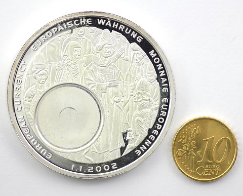 Medalje *European currencies* af forsølvet metal, diameter 50 mm., med indlagt, forgyldt 10 cent € mønt.