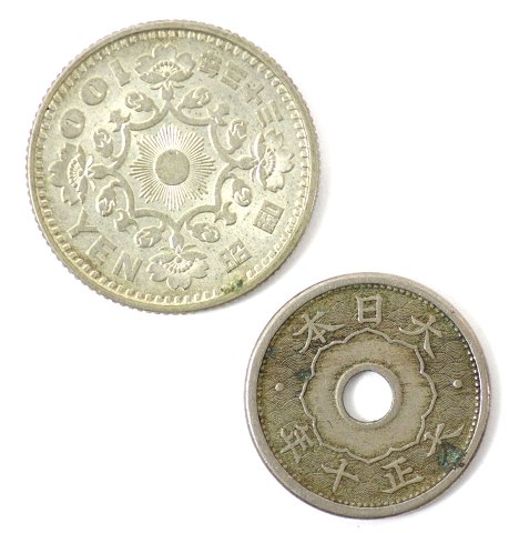 Japan, 5 Sen, 10(1921) Y# 44 og 100 Yen 33(1958) sølv Y# 77
