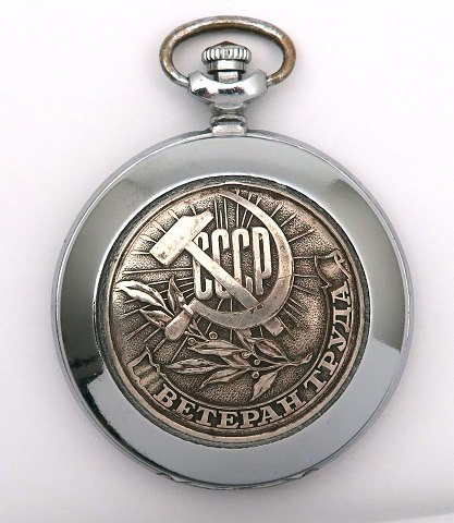 Russisk lommeur af delvist poleret stål, med dekoreret skive, romertal og separat sekundviser i "9 position. Front prydet med CCCP hammer og segl. Bagside med årstal 1941-1945. Urkasse diameter 50 mm.