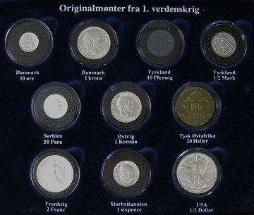 Sættet består af Dansk 10 øre 1919 SØLV - 1 krone 1915 SØLV - Tyskland 10 Pfennig 1918 - Tyskland ½ mark 1918 SØLV - Serbien 50 para 1915 SØLV - Østrig 1 korona 1914SØLV - Tysk Østafrika 20 heller 1916 - Frankrig 2 francs 1917 SØLV - Storbritannien sixpence 1914 STERLINGSØLV - USA ½ dollar 1917 SØLV. Samlet finsølvindhold ca. 38 gr. Alle indordnet i møntkasssette. Beskrivelser og certifikat medfølger.