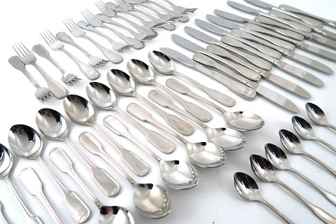 Gense Attaché, gl. riflet bestik af rustfrit stål bestående af 16 middagsskeer, 16 middagsknive, 15 middagsgafler, 6 kaffeskeer samt potageske og kartoffelske. Tåler opvaskemaskine.