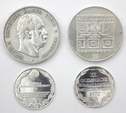 Lot bstående af 5 Mark sølv 1876 - KM# 503, 2 medaljer af sølv *Olympiade 1972 og Fifa WM 1974* samt Østrig, 100 Schilling sølv - KM# 2927