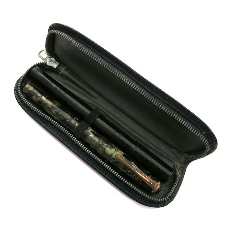 Mont Blanc fyldepen med marmoreret skaft og hyster, nib af 14 kt. guld. L. lukket 12,5 cm. samt ACME fyldepen med forgyldt nip. Acme pennen er til blæk på flaske og nip'et kan skrues ind i skaftet. L. lukket 13 cm. Etui medfølger.