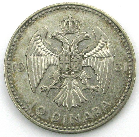 Jugoslavien, Aleksander I, 10 Dinara sølv 1931 - KM 10