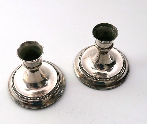 Par udfyldte stager af sølv på rund fodstykke, drevet med enkelt vulst. Fod og manchet dekoreret med perlebort. H. 7 cm. Svend Toxværd sølvsmedie - København