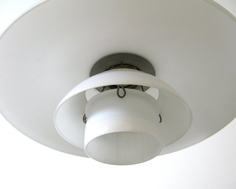 Fabriksny PH 3/2 pendel med hvide opalglas skærme, fatningshus af forkromet metal. Fremstillet hos Louis Poulsen. Diam. 29 cm.