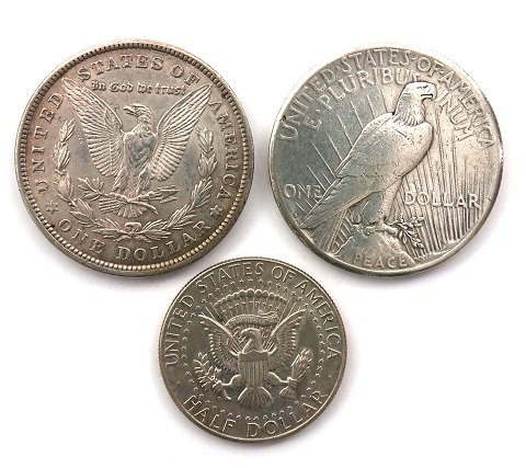 Lot bestående af *Morgan Dollar* sølv 1921, *Peace Dollar* sølv 1922S samt Half Dollar sølv 1964 *Kennedy*