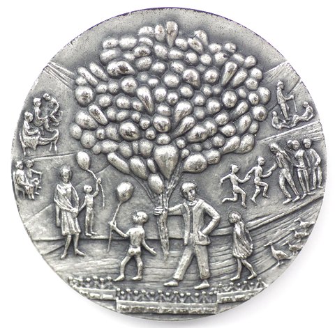Tivoli medaljen 1977 af sterling sølv, udformet af Inka Klinckhard. Diameter 50 mm., vægt ca. 84 gr. Opbevaringsetui og Anders Nyborg farvebrochure om medaljen medfølger.