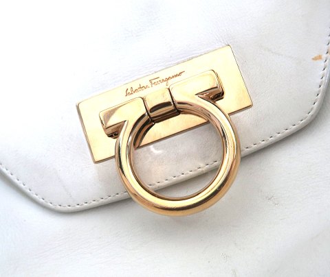 Salvatore Ferragamo dametaske af hvidt skind med beslag af messing, model AQ 21 4402. Tre indvendige fag og lynlås fag foret med denim. 2 bæreremme og og sideremme med messingbeslag. Mål ca. 23 x 33 cm.