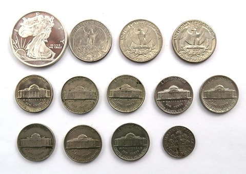 USA, ½ ounce finsølv *Eagle*, Quarter Dollars, 5 Cents og Dime (13)