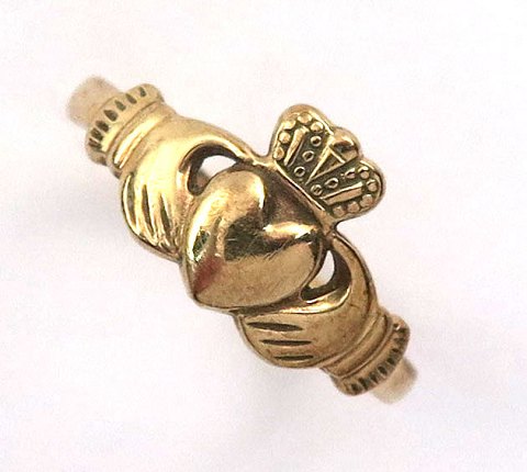 Ring af 9 kt. guld, front prydet med kronet hjerte, holdt af to hænder, den såkaldte *Claddagh Ring* Ring Str. 58, vægt ca. 3 gr.