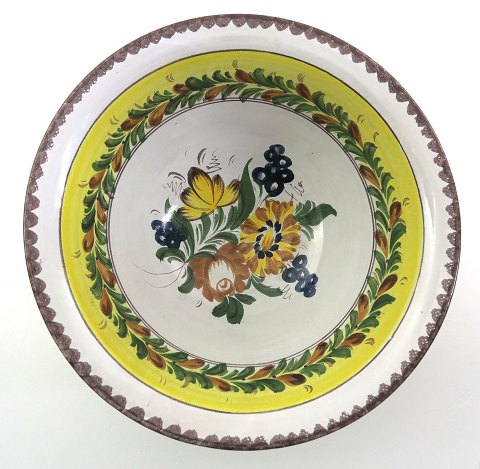 Kellinghusen skål af fajance, dekoreret med blomstermotiver og ornamentik efter 1800'tals skik og brug. Diameter 27,5 cm., H. 13 cm. Slesvig-Holsten, 20. årh.