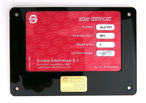 Kronprins Frederik og Kronprinsesse Marys 10 års bryllupsdag, 5 gram guldbarre i begrænset oplag, 2014. Barren, med nummereret certifikat(063/999), medfølges yderligere af ægthedsbevis og købsfaktura fra Mønthuset Danmark på 4500,-. Altsammen i kunstlæder etui med forgyldt påtryk.