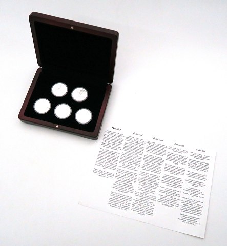 Medaljesæt, de 5 Glückburgske regenter, Christian IX, Frederik VII, Christian X, Frederik IV og Margrethe II, sølv, 31,1 gr., .925, Oplag 999 sæt. Medaljerne ligger i plastkapsler ilagt en præsentationsæske. Ægthedsbevis/ordrebekræftelse/faktura på 4000,- fra Mønthuset Danmark medfølger
