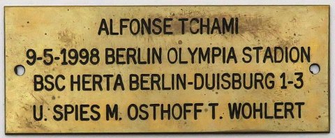 Spillertrøje båret af Alfonse Tchami d. 9-5-1998 i kampen BSC Herta Berlin-Duisburg (1-3) på Berlins Olympiske Stadion. Trøjen er indrammet bag glas, og der medfølger af en plaquette af messing, hvor navn, kamp og resultatet er indgraveret. Mål: 77 x 98 cm.