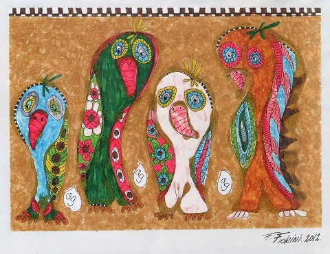 Fritze Fiorini, autodidakt, født 1943, pædagog og kunstner fra Grenå - signeret og dateret 2012, akvarel/tusch/lak i skifteramme bag glas . Motiv 30 x 21 cm.