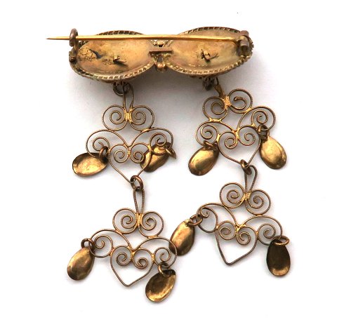 Broche med dobbeltroset, hver med filigran vedhæng. L. 55 mm. 19./20 årh.